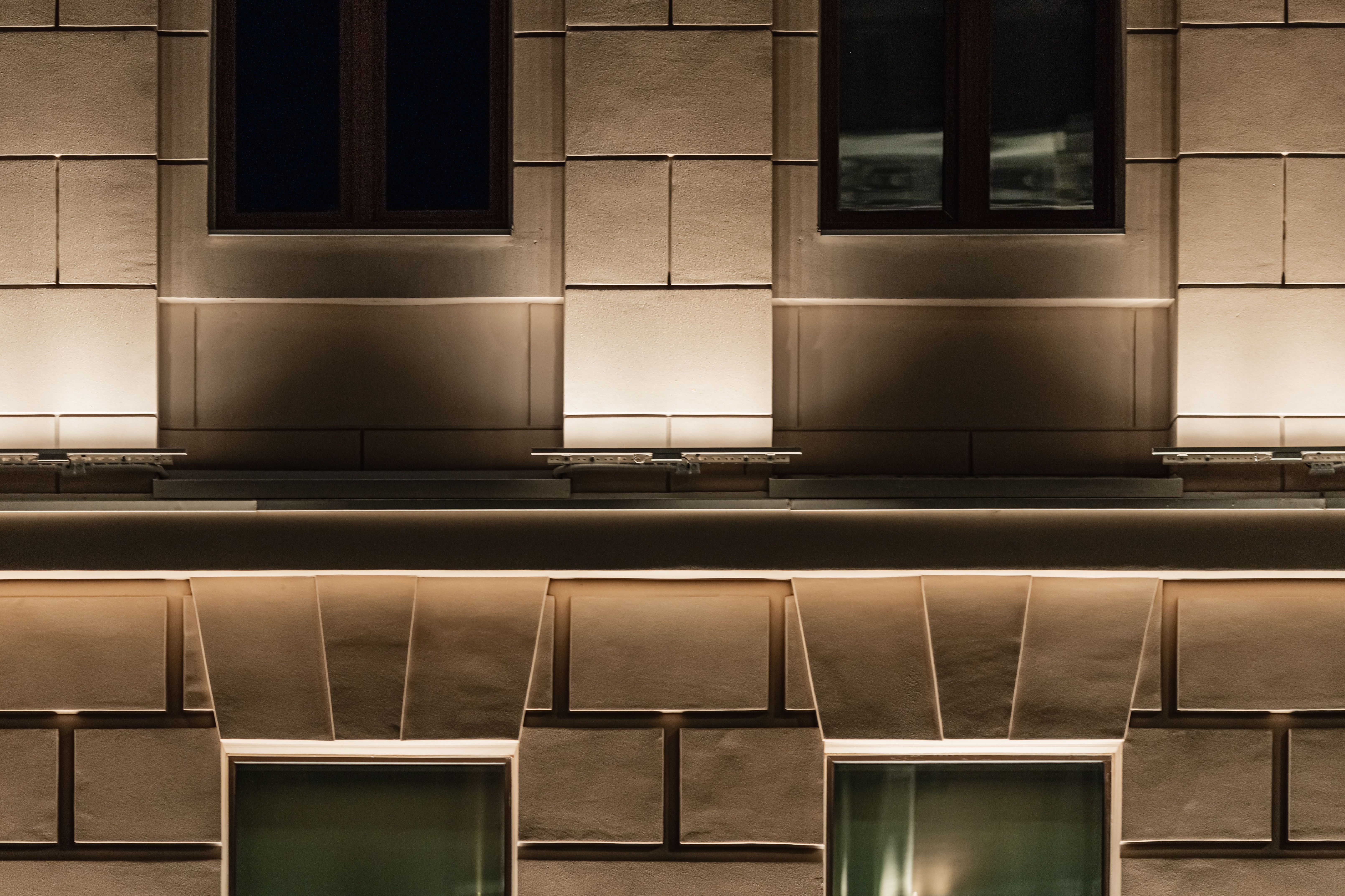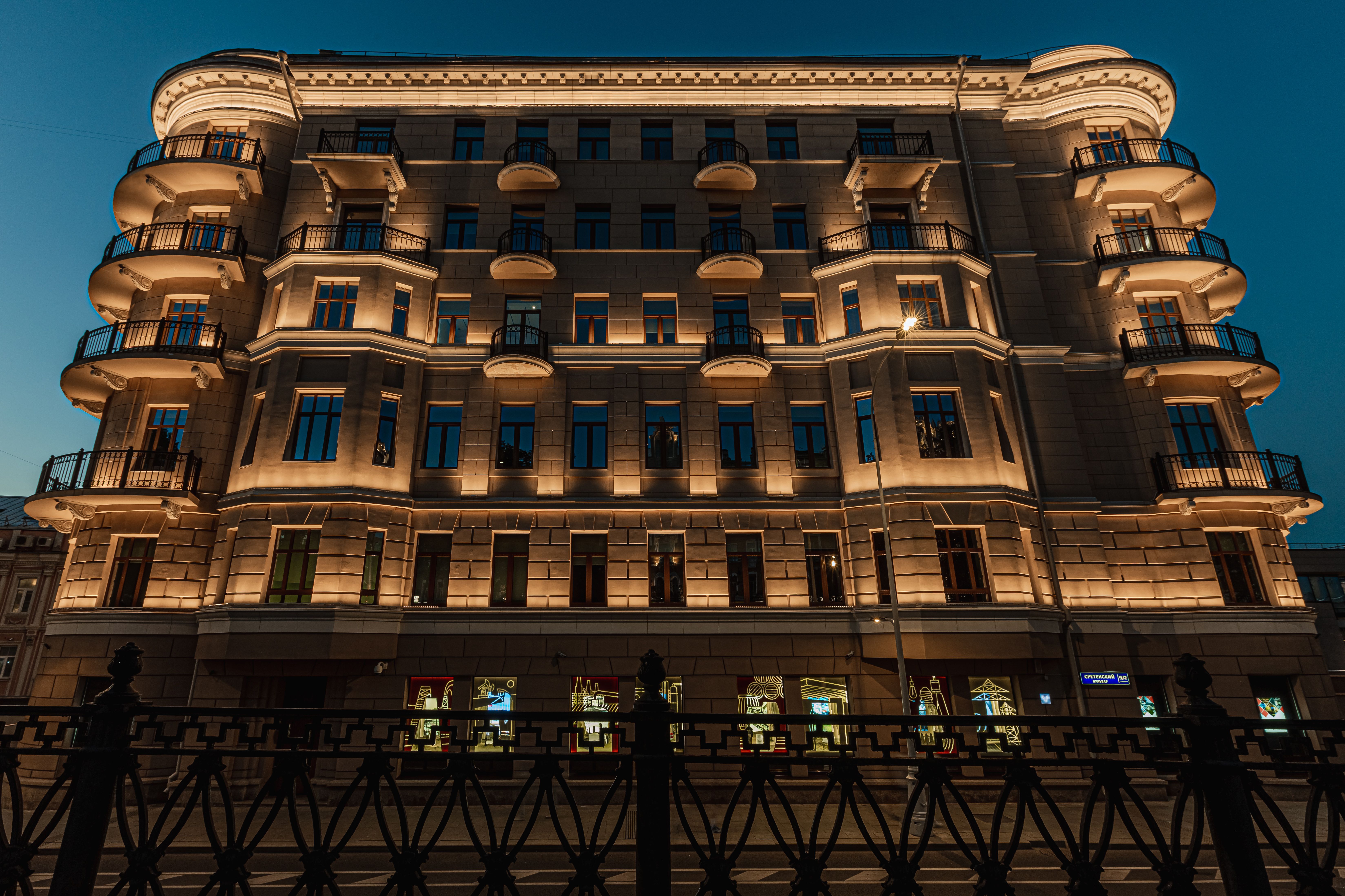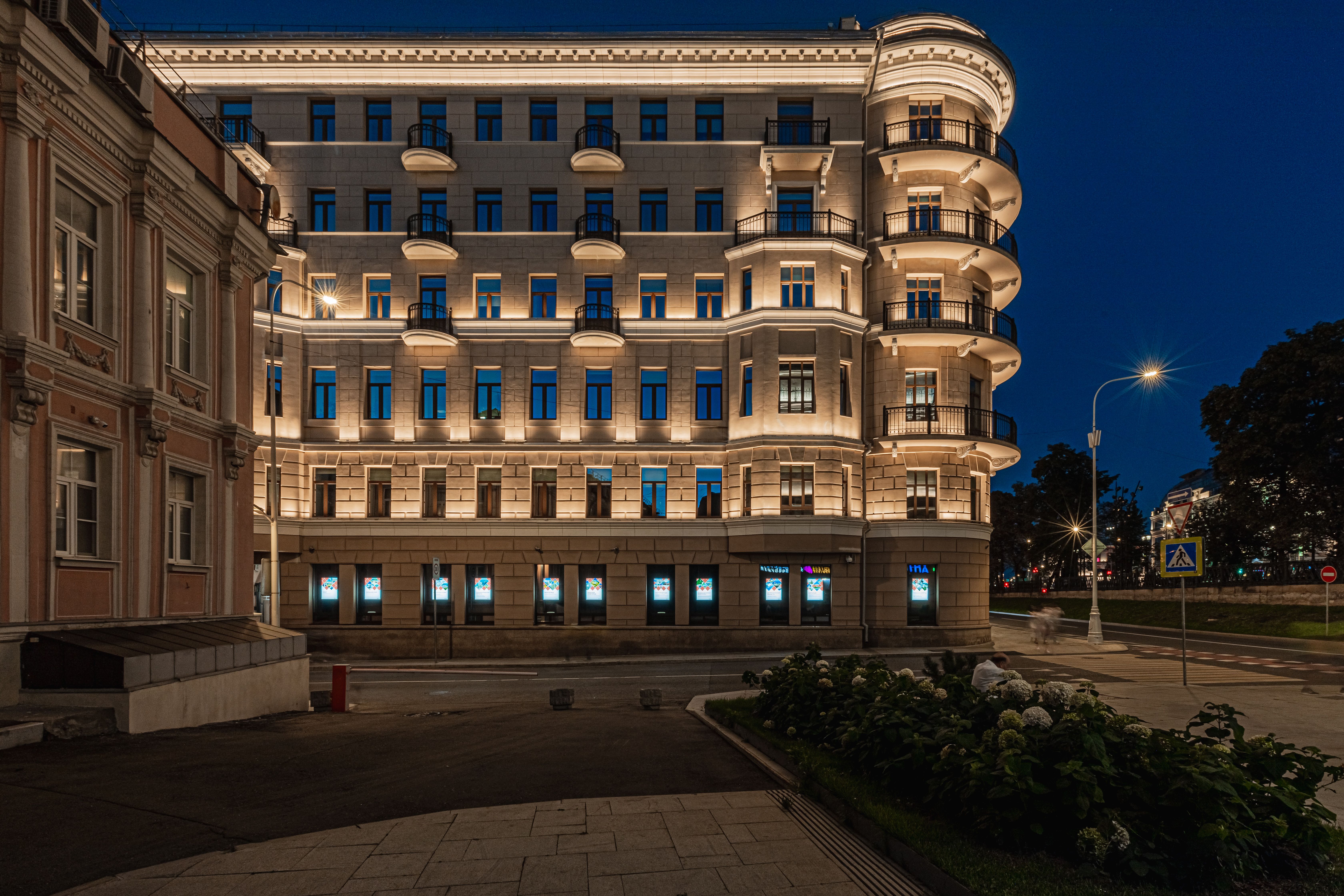 Каждая линия здания тщательно проработана светом, чтобы отметить его красоту и уникальность. Световые акценты выделяют структуры фасада, подчеркивая детали и придают зданию строгость и изящество.