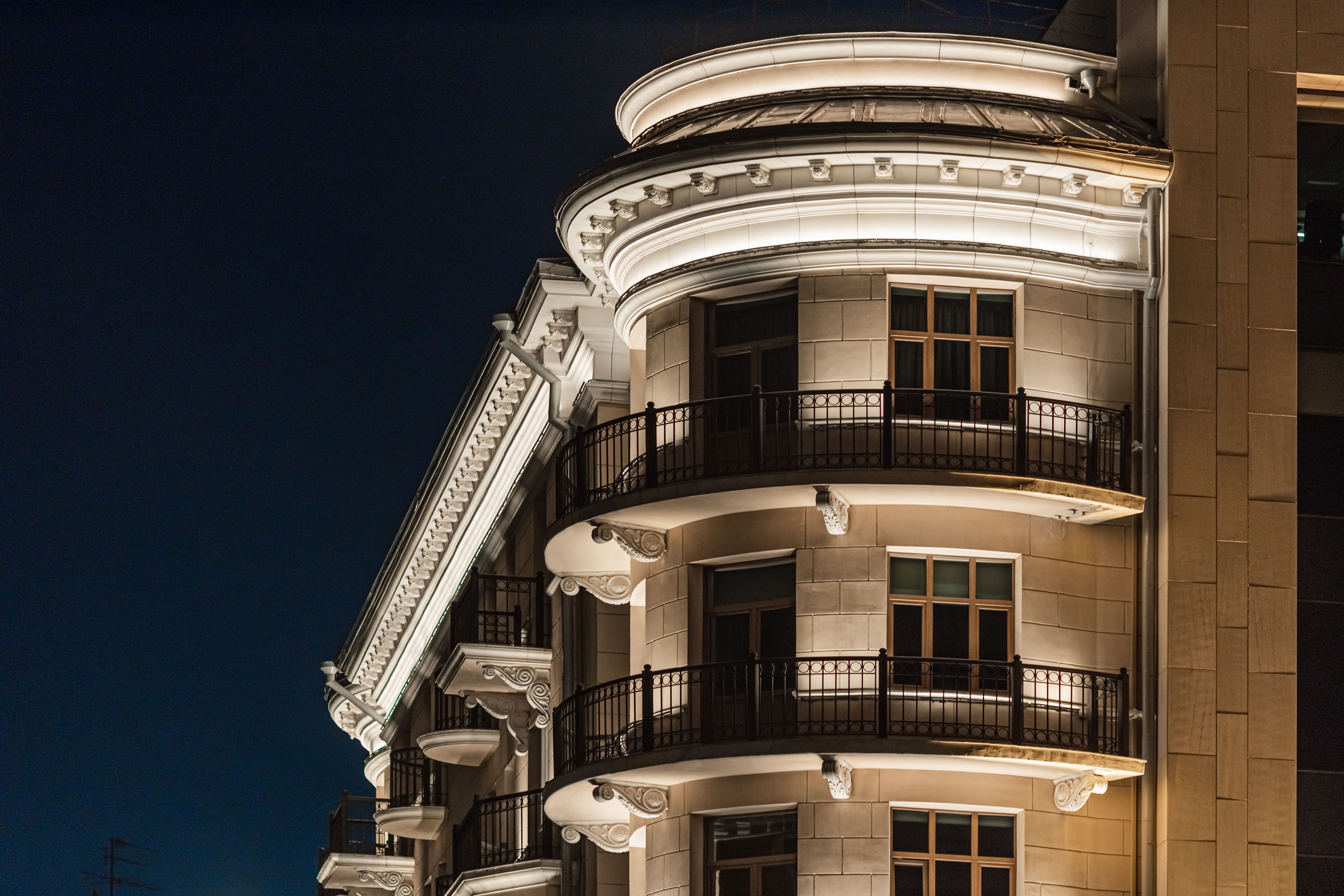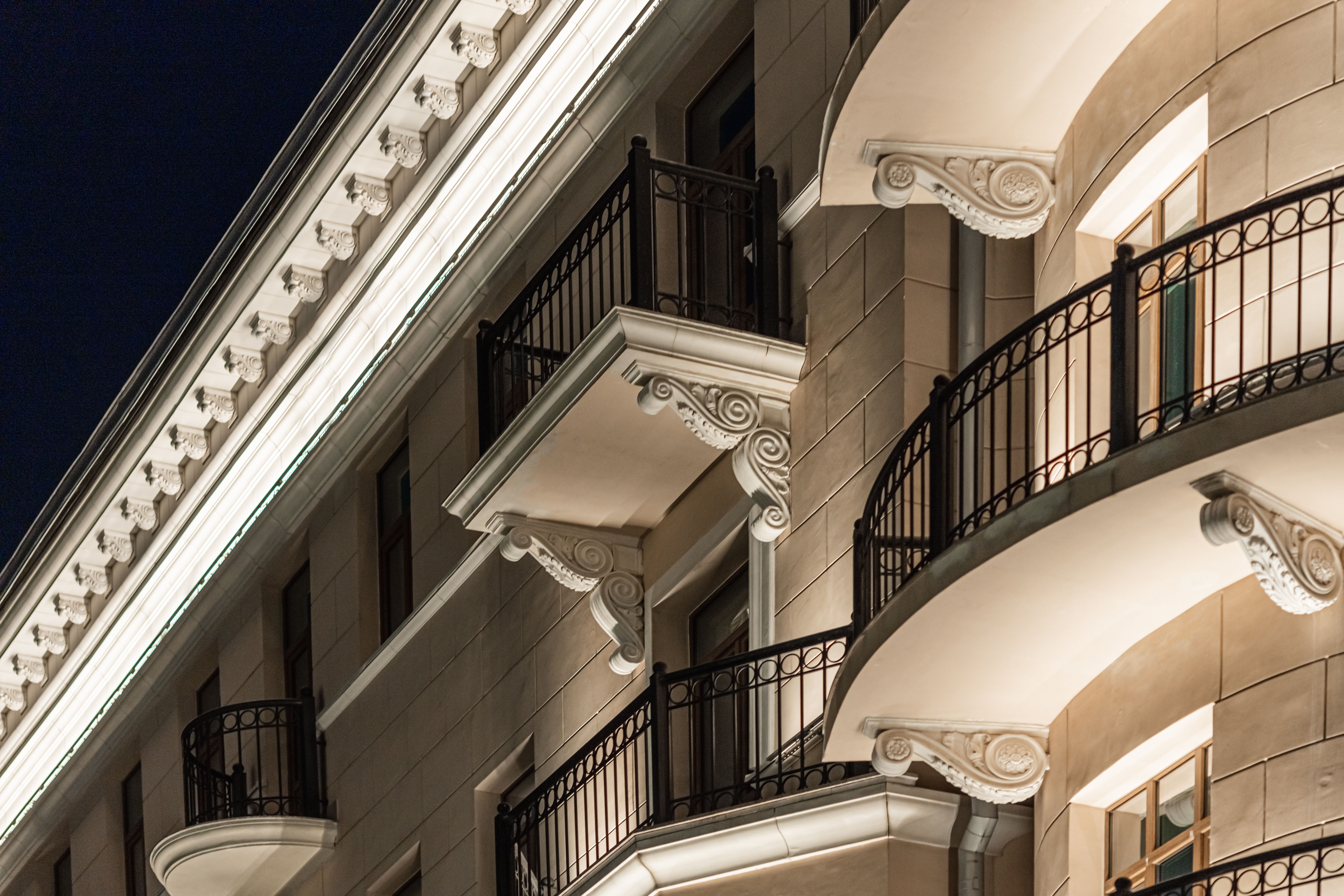 Фасад каждого здания индивидуален и в планировании освещения требует особой точности. Например, чтобы избежать светового загрязнения – излишних теней, которые могут падать от балконов – мы провели анализ и подобрали оптимальную яркость приборов.