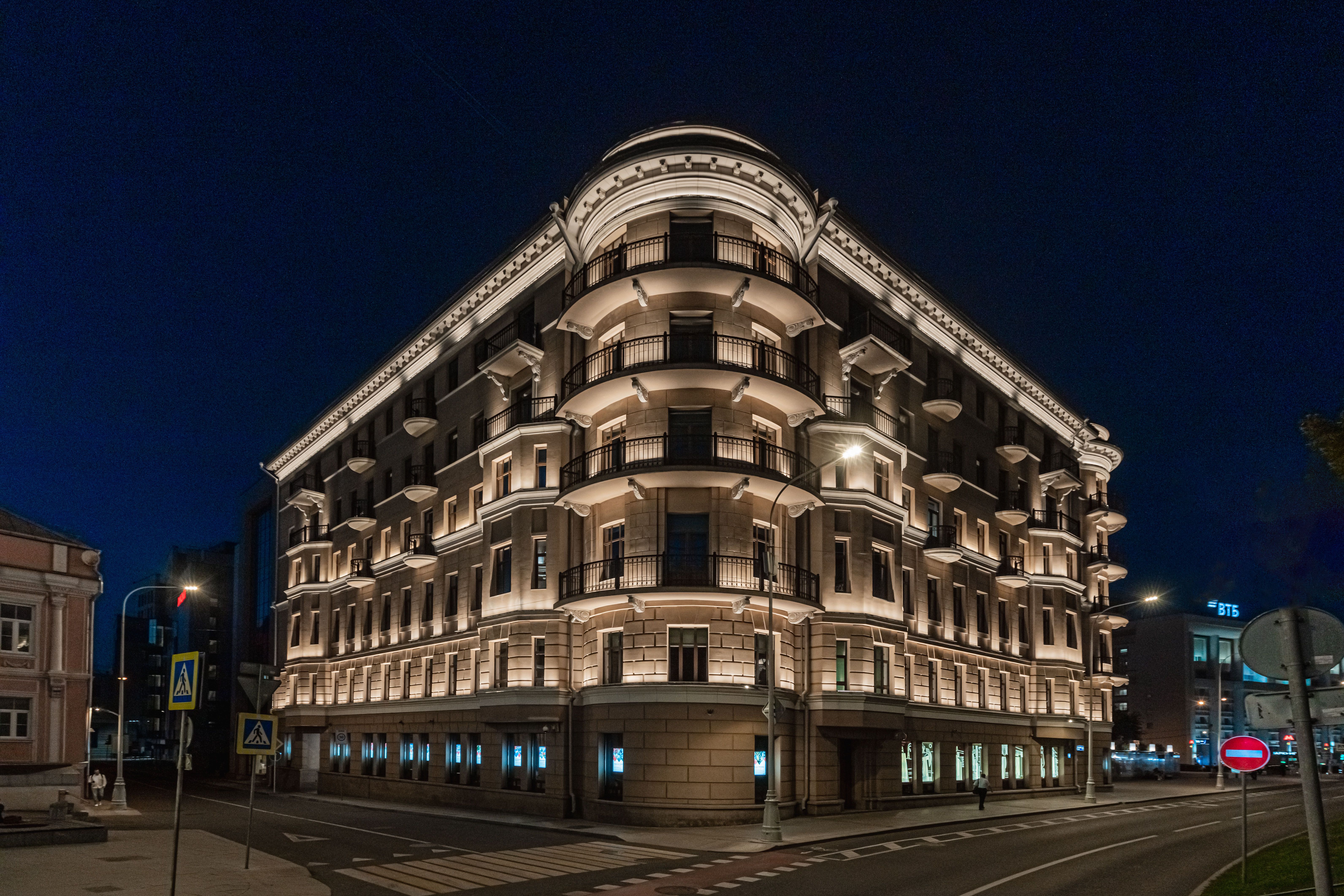 Вечером подсвеченный фасад смотрится неотразимо. Мы стремились сохранить его дневную эстетику, скрыв при этом сами приборы освещения. В качестве основного приёма использовали локально- акцентирующее освещение. Оно помогло выделить декор и архитектурные особенности объекта. Например, основная доминанта — угол здания, от которого расходятся «крылья» боковых фасадов. Здание выглядит величественным и объемным как днем, так и в вечернем свете.